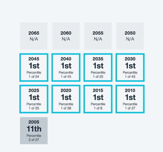 Past performance cannot guarantee future results. Data as of September 30, 2021. The Morningstar percentile ranking is based on a fund's total return relative to all funds in the respective Morningstar US Fund Target Date category for the period. The highest (or most favorable) percentile rank is 1%, and the lowest (or least favorable) percentile rank is 100%. The top-performing funds in a category will always receive a rank of 1. Results will vary for other periods, and all funds are subject to market risk.