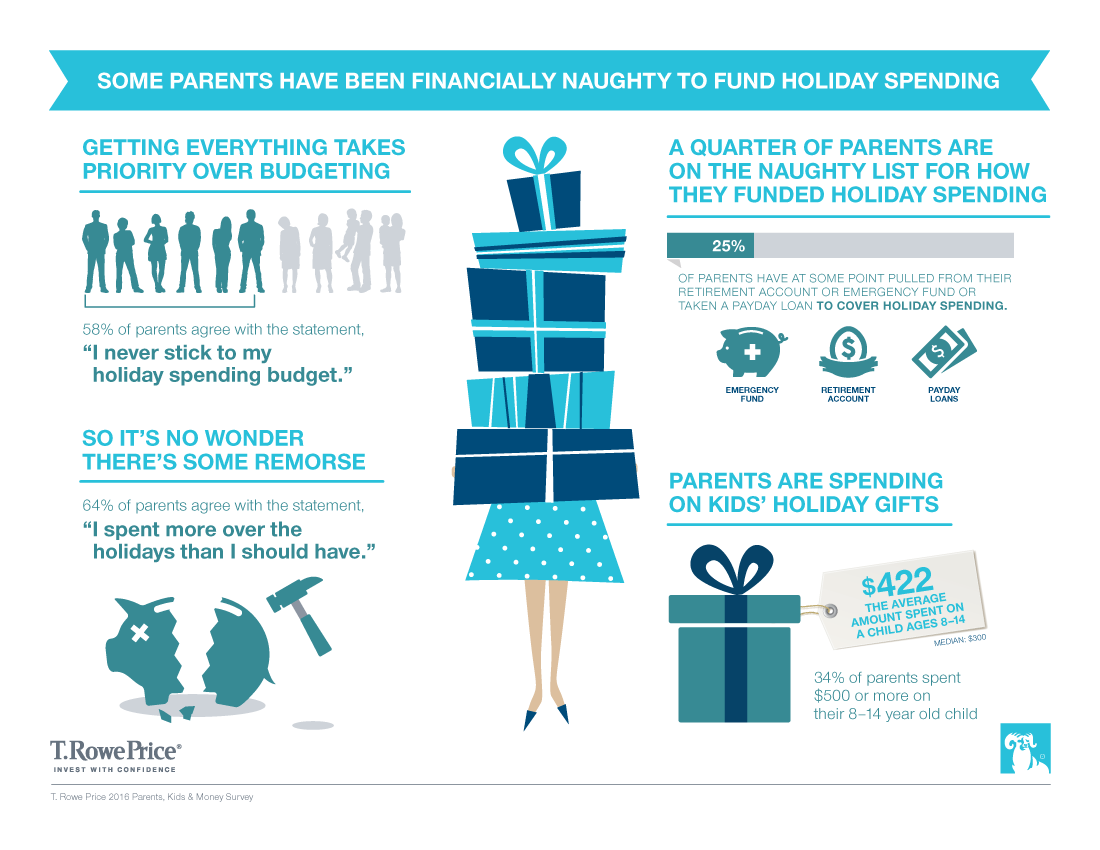 T. Rowe Price's Parents, Kids & Money Survey, which sampled more than 1,000 parents and their 8 to 14 year old kids in February 2016, revealed that many parents are willing to overextend their finances to fulfill their kids’ holiday wish lists. And 25% of parents have either taken from their 401(k)s or their emergency funds or taken a payday loan to cover holiday spending.