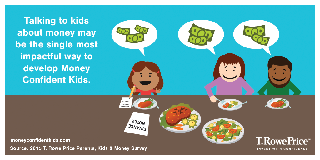 T. Rowe Price's 2015 Parents, Kids & Money Survey revealed that having conversations with kids about money is critical to raising financially savvy kids. There is also a significant benefit in letting kids experience money, and providing an allowance is one way to do that. Parents who combine conversations with experiential learning are most likely to have financially smart kids.T. Rowe Price encourages parents to invest in their kids' futures by talking to them about money matters weekly. To help, the firm createdMoneyConfidentKids.com, which provides free online games for kids, lessons for educators, and tips for parents focused on financial concepts such as goal setting, spending versus saving, inflation, asset allocation, and investment diversification.