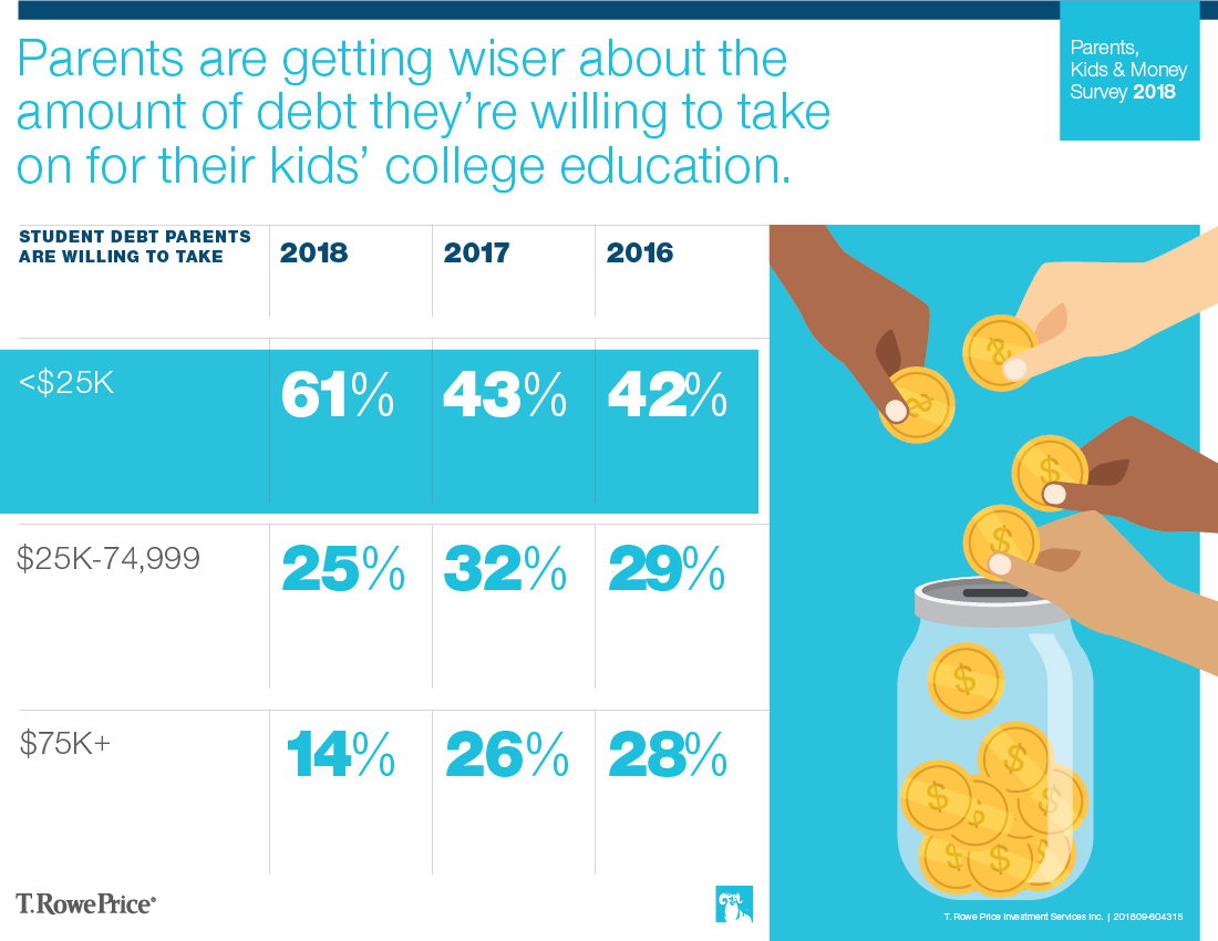 - Most parents are willing to send their kids to a less expensive school to avoid student debt: 74% of parents say they would be willing to send their kids to a less expensive school to avoid student loans this year, while only 62% would in 2017 and 71% would in 2016.