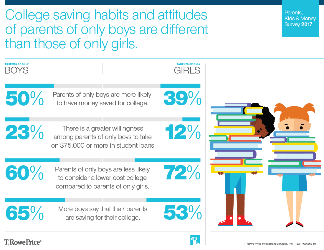 “I’m glad to see that parents of all girls seem cost-conscious about college, since price should be an important consideration, but it’s troubling that they aren’t saving as much for their kids’ college,” says Roger Young, a senior financial planner at T. Rowe Price and father of three. “Parents of both boys and girls should prepare for college costs by aiming to save at least enough for a down payment on college.