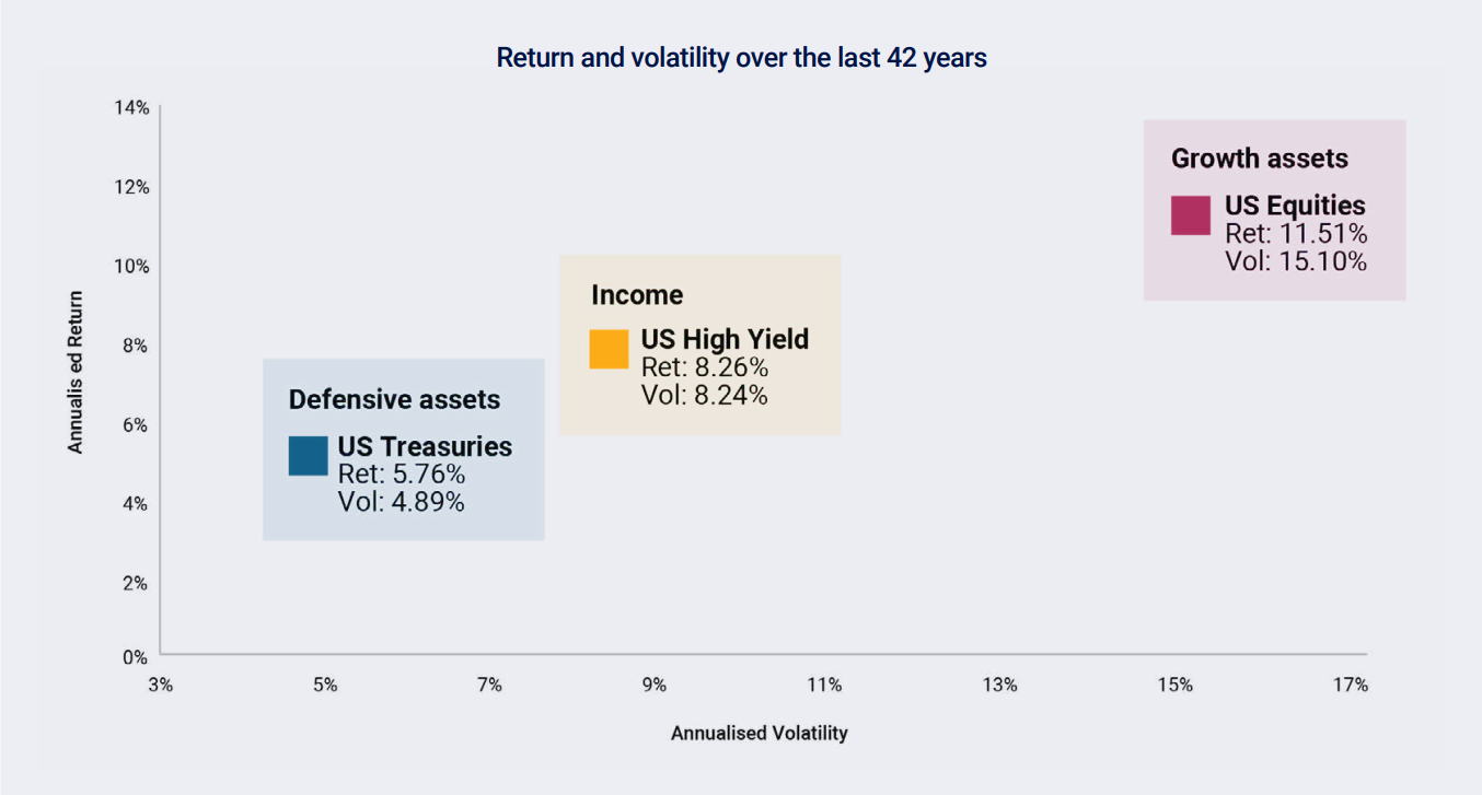 From 1 July 1983 until 30 June 2025. US Treasuries represented by the Bloomberg US Treasury Index, US high yield by the Bloomberg US Corporate High Yield Bond Index, US equities by S&P500 Index.