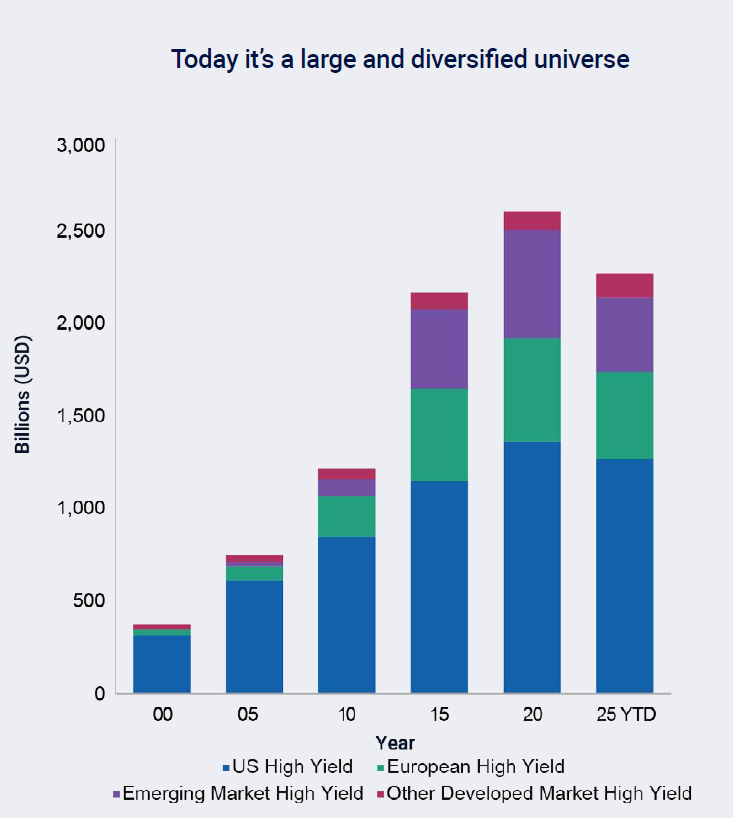 The high yield market is approximately $3 trillion AUD with over 3,200 bonds and 1,500 issuers, having grown 6x since 2000, covering US, Europe and emerging markets1.