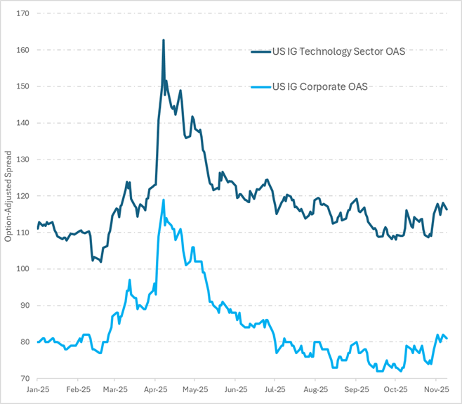 While uncertainty abounds with now more and increasingly complex AI debt-deal structures that will combine joint venture project finance, we believe there will be opportunity for asset managers who can analyze and understand the highly complex deal structures that may be present as companies issue debt in the IG corporate market to fund infrastructure spending. To this end, a yield premium has emerged based on the difference in spreads between the technology component of the Bloomberg U.S. Investment Grade Corporate Bond Index and the full Bloomberg U.S. Investment Grade Corporate Index.