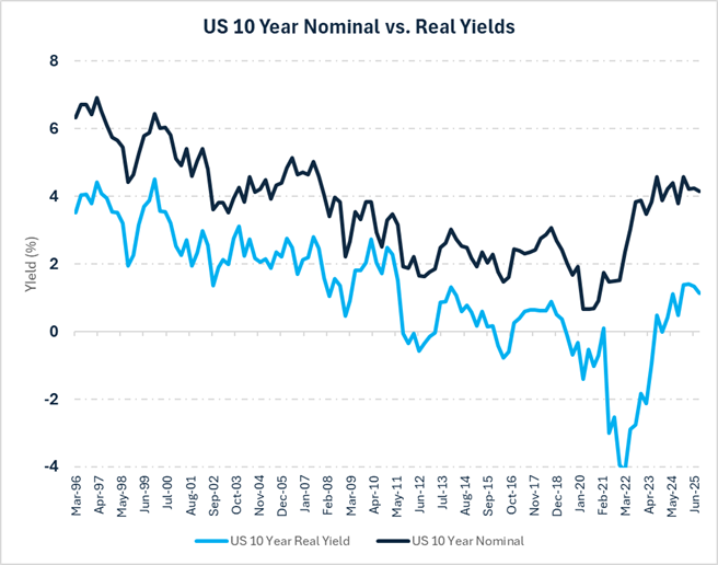 One other way to evaluate what has become a complex U.S. nominal rate environment is to reduce its noise by instead focusing on real yields, which adjust for inflation. Such a simplified view is provided in the chart on the right. As illustrated, U.S. 10-year real yields (U.S. 10-year nominal yields less U.S. CPI) in the range of 2% arguably represented a gravity point for where U.S. nominal yields ultimately landed heading into and then just beyond the Global Financial Crisis. After that, this theoretical 2% real yield range guide was shattered by an era of quantitative easing and peak globalization. Today’s world is markedly different with deglobalization trends that are being exacerbated with heightened tariff policy that now may have U.S. Treasury rates now seeking a new and higher baseline for real yields. This phenomenon may also help drive U.S. 10-year and longer maturity nominal yields higher going forward.