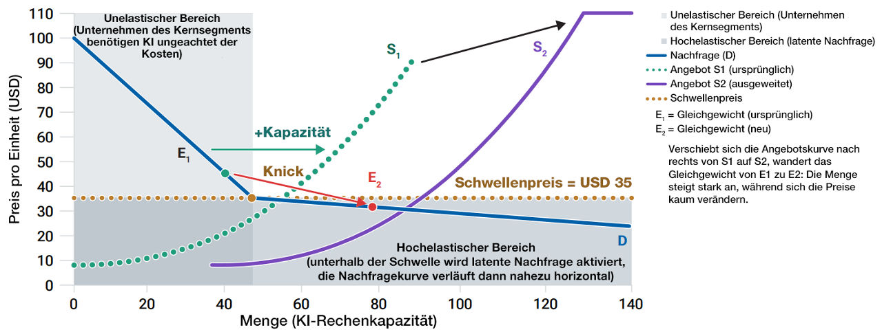 Die Preise für KI-Rechenleistung haben sich trotz massiver Kapazitätserweiterungen als widerstandsfähiger erwiesen, als es viele erwartet hatten. Eine geknickte Nachfragekurve3 liefert einen Teil der Erklärung, warum dies der Fall ist (Abbildung 1). Oberhalb einer Preisgrenze (in diesem Beispiel 35 USD) ist die Nachfrage relativ unelastisch, da Unternehmen und strategische Nutzer KI unabhängig von den Kosten als geschäftskritisch betrachten. Unterhalb dieser Preisschwelle entsteht schnell eine latente Nachfrage, da eine versuchsweise Nutzung, neue Anwendungsfälle und interne Modelltrainingsarbeiten wirtschaftlich rentabler werden.