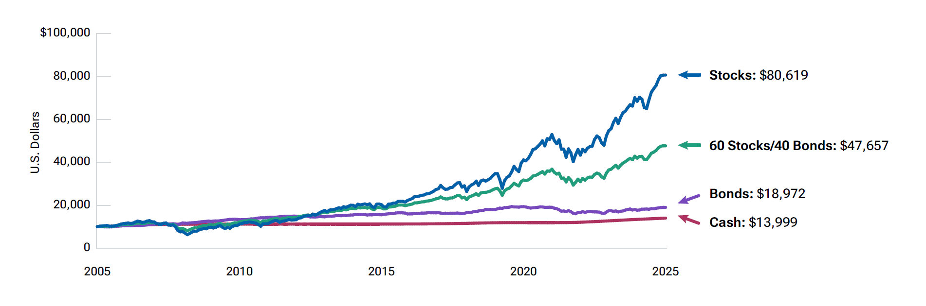 Over a 20-year period, stocks and bonds have each experienced their own periods of dips and rallies—though, ultimately,they’ve continued on an upward trajectory over time.
