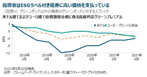 このいわゆる「グリーンプレミアム」は、ESGラベル付き債券のスプレッドを同じ発行体のラベルが付いていない債券と比較したものであり、時間の経過に伴い、同資産クラスに対する需要の増大につれて拡大してきました。例えば、ユーロ建てESG債は、徐々に割高になっており、ティー・ロウ・プライスの分析によれば、通常の債券に約3bpsのプレミアムが上乗せされたスプレッド水準で取引されています。また、米ドル建てESGラベル付き債券は、2021年最初の9ヵ月で前年と比べて割安になってきましたが、ESG債以外の債券よりまだ平均して5bps割高でした。