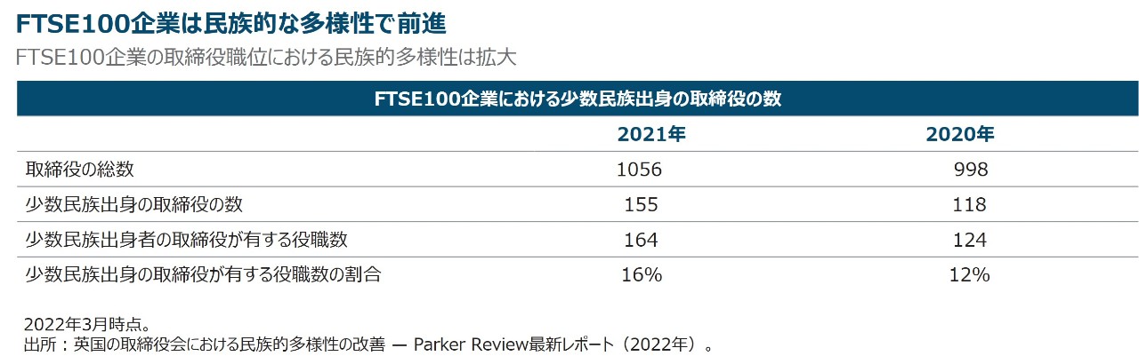 英国の「30%クラブ」などのように、一部の国において遅れをとっている企業に多様性を促す団体が現れ始めているものの、投資先企業の非業務執行取締役の採用がどれだけ進展しているかを監視し、進展が遅すぎる場合に会長の選任に反対票を投じることを検討することは、依然として投資家やポートフォリオ・マネジャーに委ねられています。ティー・ロウ・プライスは、最近FTSE100企業の取締役会は少数派の民族または人種グループの取締役を最低1名含むべきだと考え、議決権行使ガイドラインを改定しました。当社は、ジェンダーの多様性と同様のアプローチで、動きが遅れている企業との対話を進める方針です。