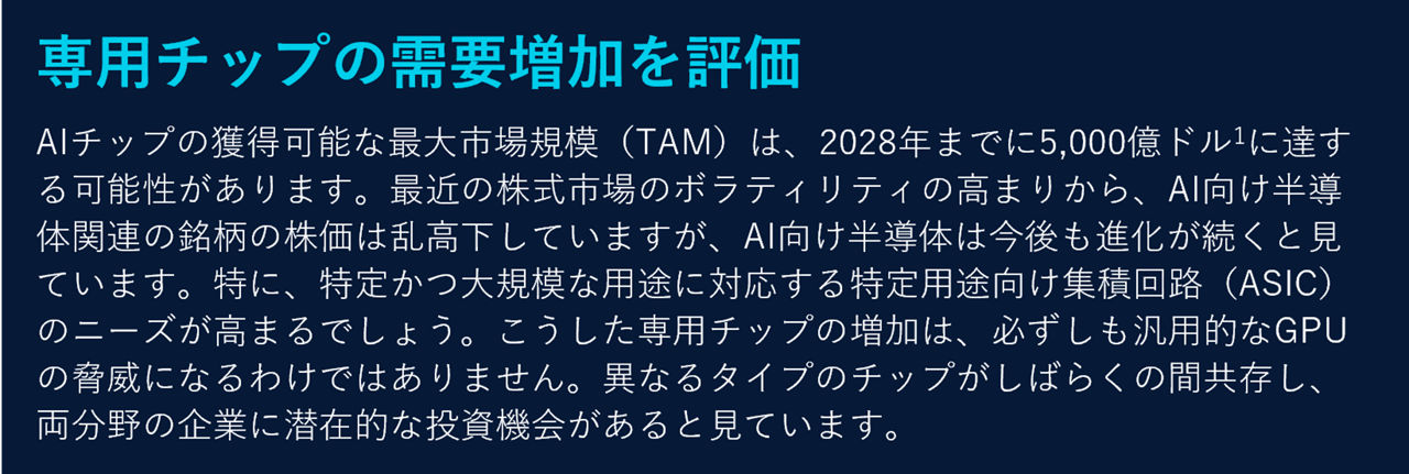 AIアプリケーションのイノベーションが加速し需要を押し上げるなかで、AI革命の推進力となっている先進半導体メーカーは、優位な立ち位置にあると考えられます。大手企業は、AIを支えるインフラに多額の投資を継続すると見込まれ、AIや新技術への需要は、向こう12ヵ月間にわたって堅調に推移すると予想しています。特に、汎用グラフィックス・プロセシング・ユニット(GPU)から特定用途向け集積回路(ASIC)へと、デジタル半導体の用途の広がりが見られます。また、ディープシークのような新しい低価格のAIモデルが市場に与える破壊的な影響も注視しています。今後も大小様々なAIモデルが誕生していくと予想しています。消費者向けに最適対応を追求するAIの用途では、より大規模なAIモデルが必要となり、コストがかかります。そうしたAI利用がより現実的に普及するには、より手頃な価格のAIモデルが重要な鍵となるかもしれまません。その結果、中期的にAIが広く採用されるにつれて、学習や推論の需要がますます高まると考えられます。