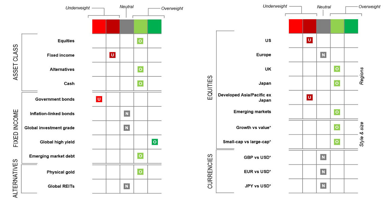 * For pairwise decisions in style, market capitalisation (size) and currencies, positioning within boxes represents positioning in the first‑mentioned asset class relative to the second asset class.