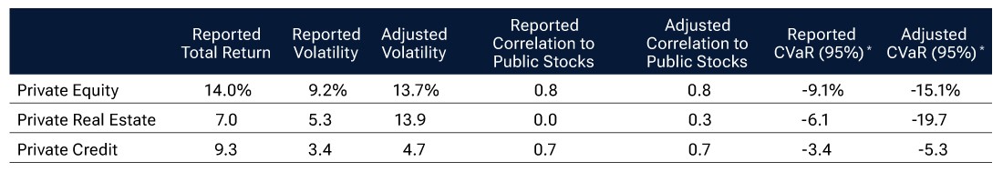 Note: Private asset returns can be adjusted to account for smoothing in several ways. The first-order autoregressive, or AR(1), model used in the table above postulates that the reported return is a weighted average of the true unobserved return for that quarter and the return in the prior quarter.