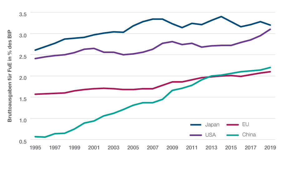 Investitionen in die Forschung und Entwicklung (FuE) sind für viele Privatunternehmen von zentraler Bedeutung und schaffen erst die Voraussetzungen dafür, dass neue Produkte und Dienstleistungen auf den Markt gebracht werden können. Sie spielen zudem eine wichtige gesamtwirtschaftliche Rolle, indem sie maßgebliche Beiträge zum BIP-Wachstum leisten. Laut Daten der chinesischen Statistikbehörde kletterten Chinas FuE-Ausgaben im Jahr 2020 um 10,3% auf 2,44 Billionen Yuan (378 Mrd. USD). Das entsprach 2,4% des chinesischen Bruttoinlandsprodukts und markierte einen neuen Rekordwert. Für Peking haben die Ausgaben für Forschung und Entwicklung Priorität im Rahmen seiner „dualen“ Strategie, die auf Wachstum mit höherer Wertschöpfung bei gleichzeitiger Wahrung der globalen Wettbewerbsfähigkeit der chinesischen Wirtschaft setzt.