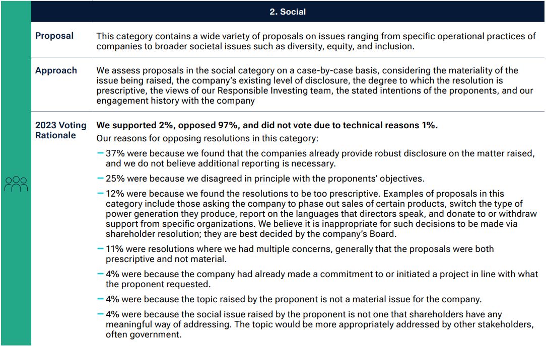Given the very wide spectrum of social views held by the clients we serve, we have concluded that it is not appropriate to use our clients’ voting power to support actions designed to achieve outcomes that are unrelated to investor returns. We are only inclined to support resolutions that can be directly tied to long-term value creation.