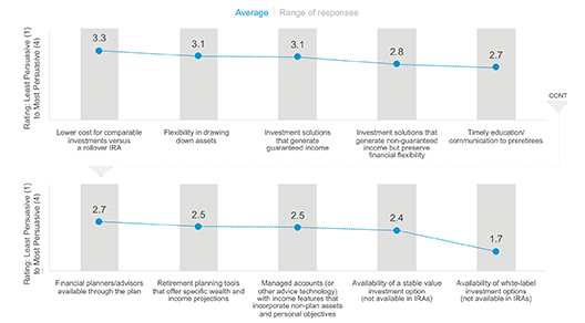 - T. Rowe Price data suggest that more participants are remaining in their DC plans for longer after they retire. Potentially accelerating this trend, lower cost for comparable investments versus a Rollover IRA, flexibility in drawing down assets, and investment solutions that generate income were all cited as features that may best persuade more participants to stay in plan after they retire (Figure 1).