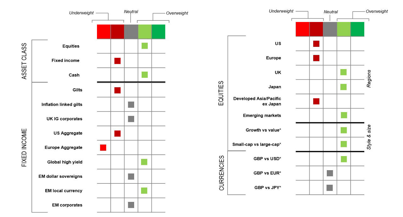 * For pairwise decisions in style, market capitalisation and currencies, positioning within boxes represents positioning in the first‑mentioned asset class relative to the second asset class.