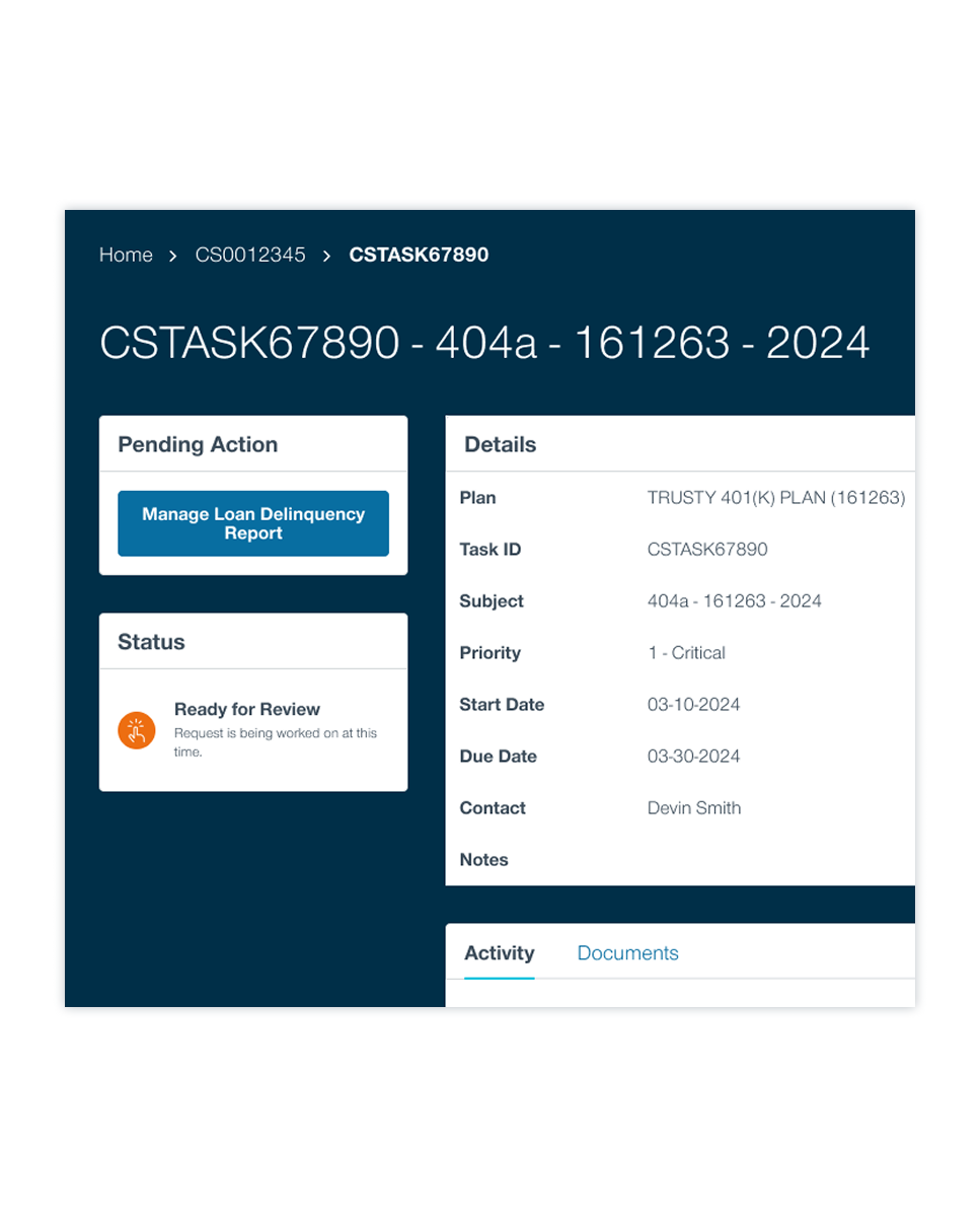 Assigned users will receive an automatic email notification when their LDR is ready for viewing. You will find a new task created for your Loan Delinquency Report on the Plan Activity page.